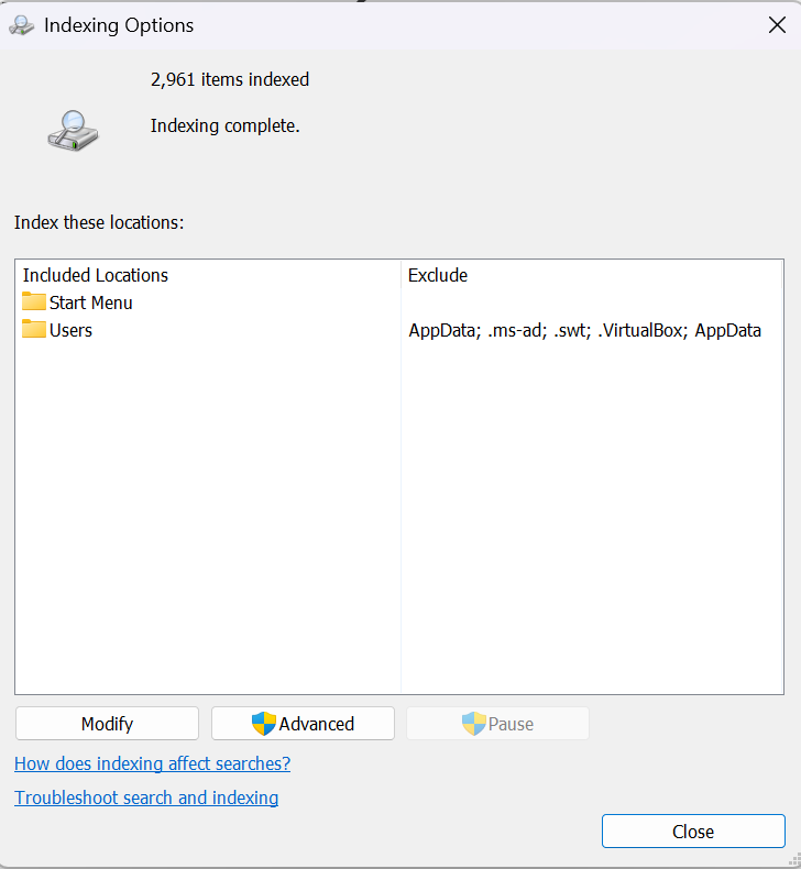 Để làm điều này, hãy mở menu Start, tìm kiếm một từ khóa, sau đó nhấp vào ba dấu chấm ở cạnh phải của các từ khóa tìm kiếm được đề xuất ở phía trên cùng của giao diện — bên cạnh biểu tượng tài khoản của bạn. Nhập các tùy chọn lập chỉ mục và sau đó nhấp vào tùy chọn “Advanced Indexing”, tiếp theo là nút “Advanced” để mở hộp thoại mới.