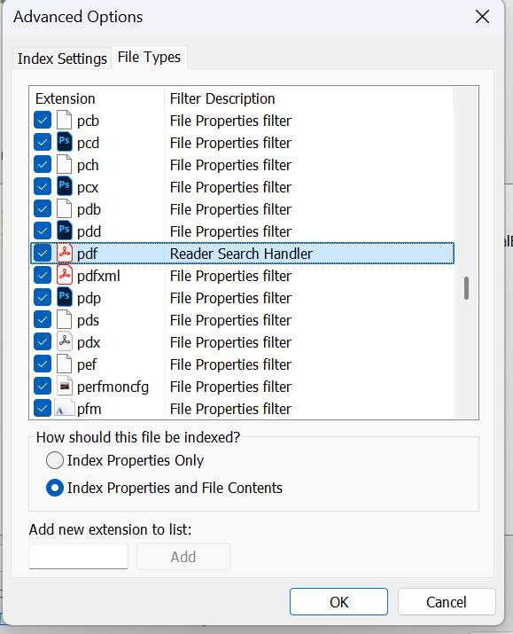Chuyển sang tab “File types” và cuộn xuống mục “pdf”. Mục này phải được chọn và mô tả bộ lọc bên cạnh phải là “Reader Search Handler”. Chọn mục này và đảm bảo rằng tùy chọn “Index properties and file contents” được kích hoạt trong danh sách. Nếu không, hãy điều chỉnh cài đặt cho phù hợp và xác nhận bằng “OK”.