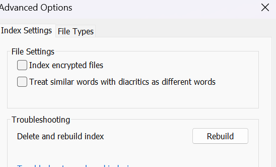 Tiếp theo, bạn cần xây dựng lại chỉ mục tìm kiếm của Windows. Để làm điều này, hãy mở lại cửa sổ “Indexing options” và nhấp vào “Advanced”. Trong tab “Index settings” ở khu vực “Troubleshooting”, nhấp vào nút “Rebuild” bên cạnh “Delete and rebuild index” và xác nhận thông báo bằng “OK”. Khi chỉ mục được tạo sau đó, các tệp PDF chưa được bao gồm trước đó sẽ được thêm vào chỉ mục. Lưu ý: Việc xây dựng lại chỉ mục có thể mất vài giờ hoặc thậm chí cả ngày!