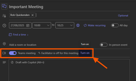 Khách hàng có thể bật Facilitator từ Teams hoặc Outlook. Đối với Facilitator, hãy điều hướng đến Calendar > New Event > Turn on (sẽ hiển thị bên cạnh thông báo “Facilitator is off for this meeting”). Về phần sau, hãy vào Calendar > New Meeting > More commands (…) > Teams Meeting > Set up your Teams meeting > toggle Facilitator.