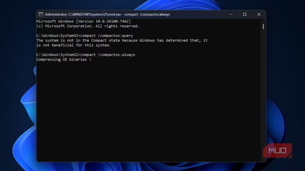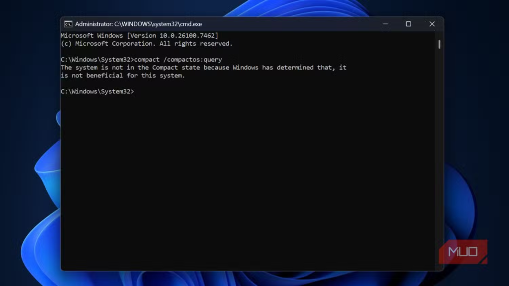 Windows sẽ cho bạn biết hệ thống có đang ở trạng thái nén hay không. Nếu hiển thị “The system is not in the Compact state”, bạn có thể tiếp tục. Nếu tính năng nén đã được kích hoạt, bạn sẽ không nhận được lợi ích gì khi chạy lại lệnh này.
