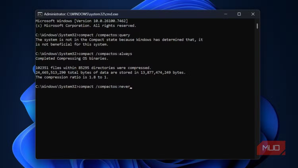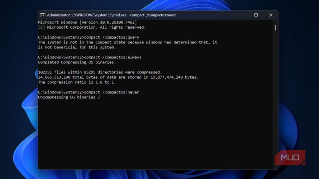 Sau khi hoàn tất, bạn sẽ thấy bản tóm tắt hiển thị số lượng tập tin đã được nén và tổng dung lượng đã tiết kiệm. Máy tính của bạn sẽ tiếp tục hoạt động bình thường — quá trình nén diễn ra trong nền. Tuy nhiên, nếu sau này bạn đổi ý hoặc nhận thấy bất kỳ sự cố nào, việc hoàn nguyên cũng rất đơn giản. Mở Command Prompt với quyền quản trị viên một lần nữa và chạy lệnh ngược lại: