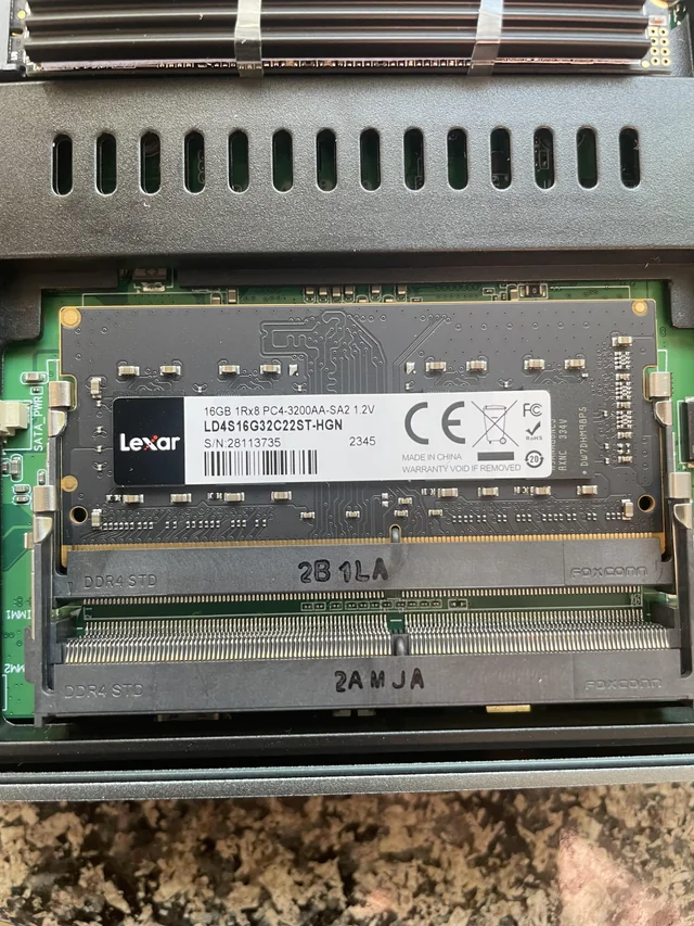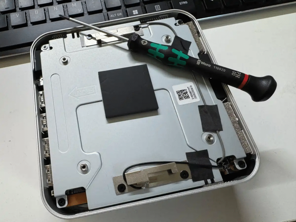 Sau khi các bộ phận bên trong của máy tính mini được lộ ra, bạn có thể tiếp cận các khe cắm cho hai ổ SSD (1 × M.2 2280 và 1 × M.2 2230) và hai khe cắm bộ nhớ. Một số máy tính mini còn có giá đỡ cho ổ SSD SATA 2,5 inch, chẳng hạn như Samsung 870 EVO.