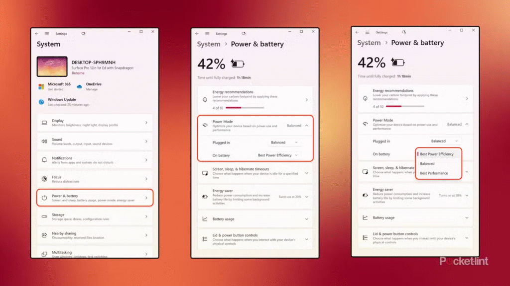 Ngay khi xuất xưởng, các nhà sản xuất phần cứng có thể cấu hình PC của họ mặc định ở bất kỳ cấu hình năng lượng nào họ thấy phù hợp. Hầu hết máy tính xách tay chạy Windows 11 đều được mặc định đặt Chế độ Năng lượng Khi dùng pin là Balanced, nhưng hiệu suất của từng máy có thể khác nhau. Ví dụ, chiếc Surface Pro 12 inch của tôi đã được đặt ở Best Power Efficiency  nhất khi tôi thiết lập lần đầu tiên.