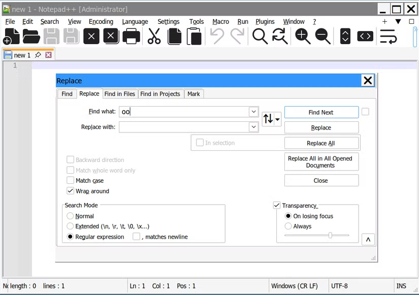 Notepad++ đưa điều này lên một tầm cao mới bằng cách cho phép bạn sử dụng biểu thức chính quy (regex) để định dạng các đối số tìm kiếm và thay thế. Biểu thức chính quy cung cấp cho bạn khả năng kiểm soát chi tiết hơn nhiều đối với cách thức hoạt động của tìm kiếm và thay thế.
