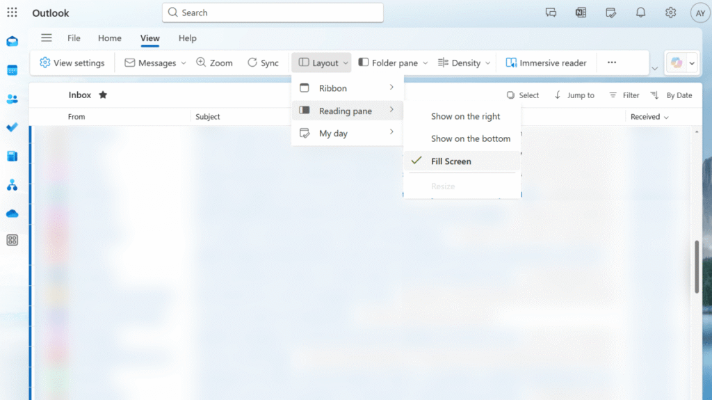Trong màn hình chính của Outlook dành cho web, hãy nhấp vào View > Layout > Reading Pane > Fill Screen.