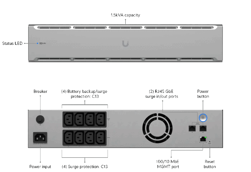Bộ lưu điện Unifi UPS Tower được thiết kế để lắp đặt trên máy tính để bàn. Ngoài cổng mạng tích hợp Unifi và khả năng chống sét lan truyền cho các kết nối mạng qua GbE, bộ lưu điện này còn cung cấp tổng cộng mười cổng C13 cho phích cắm C14. Tất cả các cổng đều được chống sét lan truyền, và năm trong số các cổng này được dự phòng thêm bởi pin bên trong để cung cấp nguồn điện liên tục.