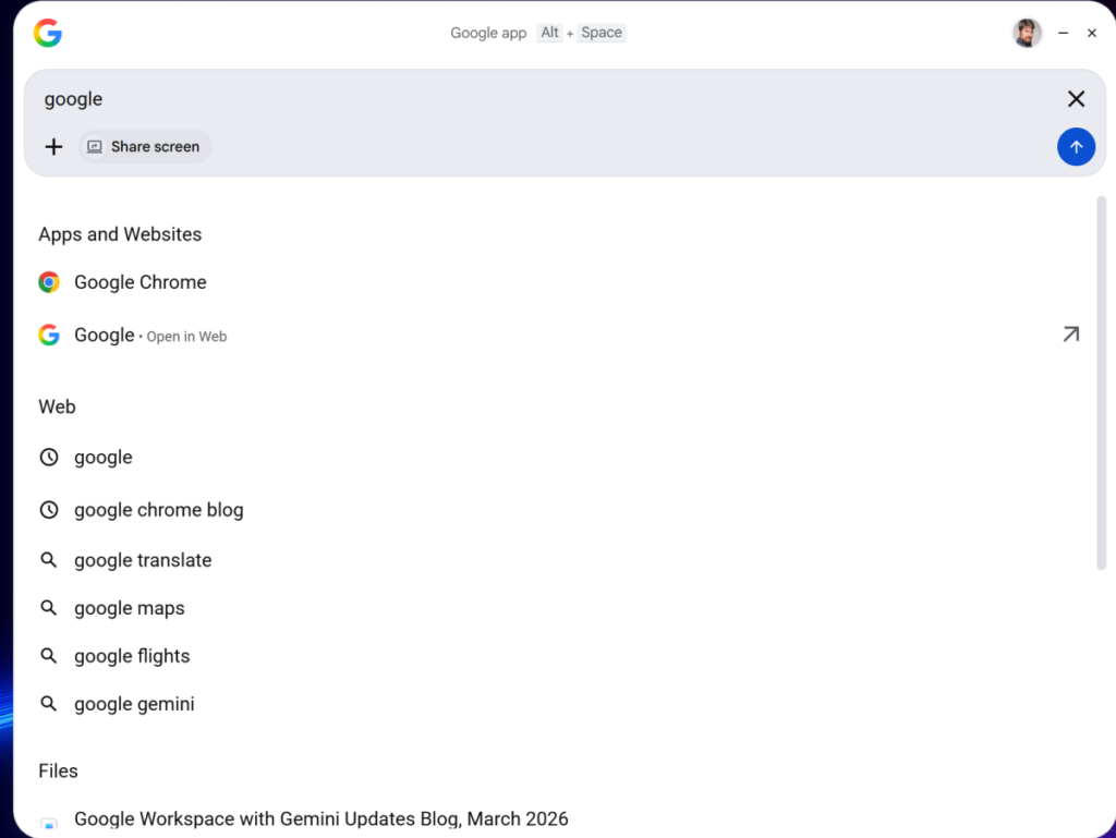 Ứng dụng Google mới (có sẵn ngay hôm nay trên các máy tính sử dụng tiếng Anh) có thể khiến bạn nhớ đến phiên bản mới nhất của ứng dụng “Spotlight” trên macOS đã có mặt cách đây 20 năm, vừa là trình quản lý tập tin, vừa là trình khởi chạy ứng dụng, và cũng là công cụ tìm kiếm tinh vi. Ứng dụng Google mới này nổi trên màn hình máy tính của bạn giống như Spotlight, nhưng để sử dụng nó, trước tiên bạn cần cài đặt và – để có kết quả tốt nhất – đăng nhập.