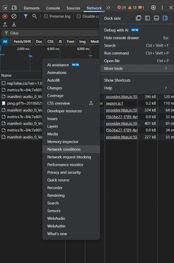 - Tùy chọn “Network Conditions” sẽ hiển thị trên trình duyệt của bạn. Nếu không, hãy vào “More tools” và nhấn vào “Network Conditions”.