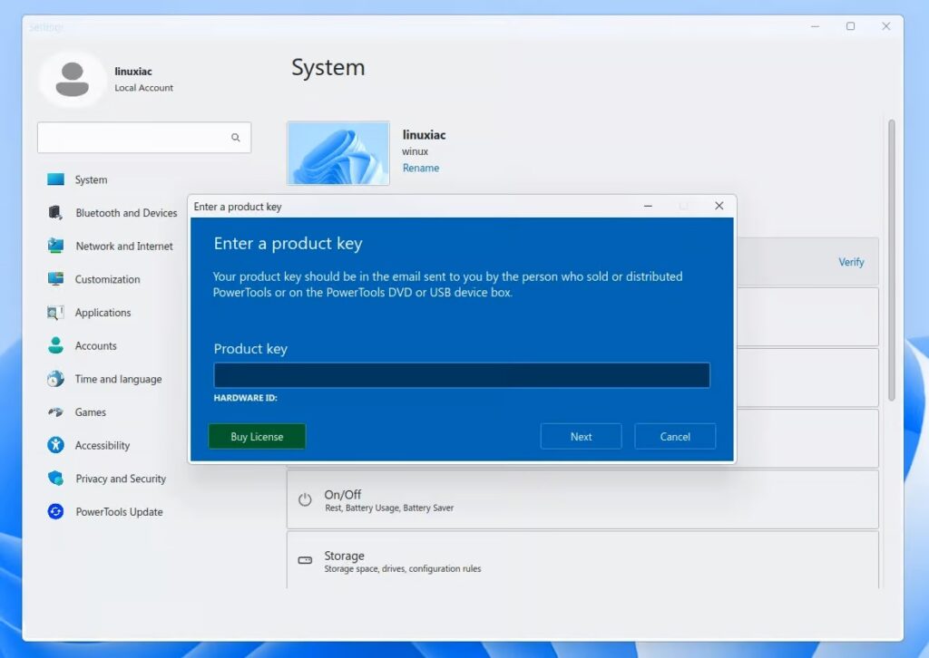 Hệ thống được quản lý thông qua Cài đặt Hệ thống, mà (không có gì đáng ngạc nhiên) rất giống với những gì được tìm thấy trong Microsoft Windows. Và bây giờ là một điều quan trọng. Winux tuân theo mô hình kiếm tiền tương tự như Zorin OS: phiên bản cơ bản là miễn phí, nhưng để mở khóa toàn bộ các tính năng, bạn cần có khóa sản phẩm cho ứng dụng PowerTools nội bộ, có giá 19,99 đô la.
